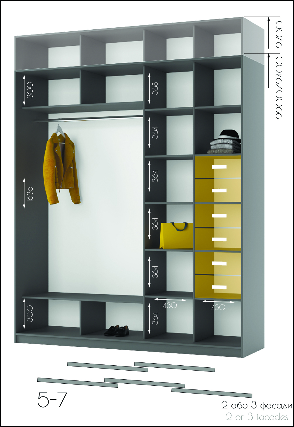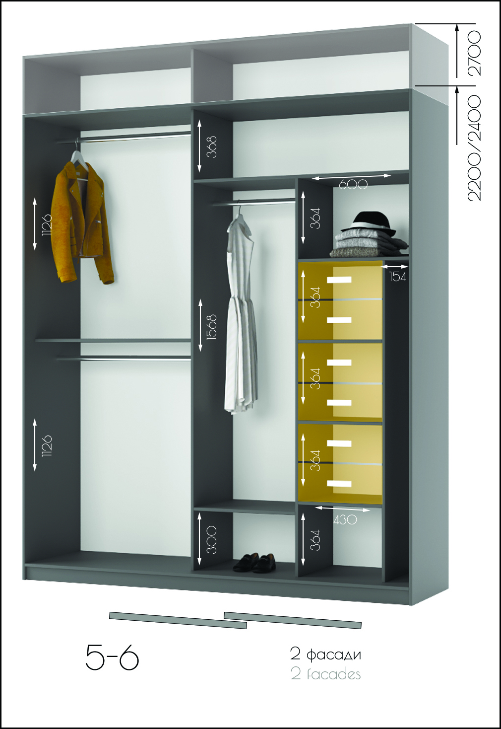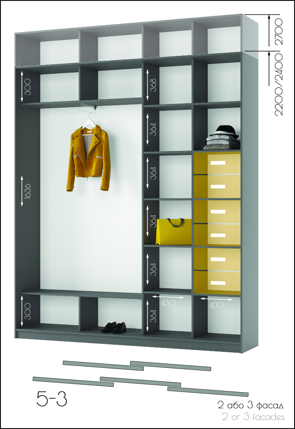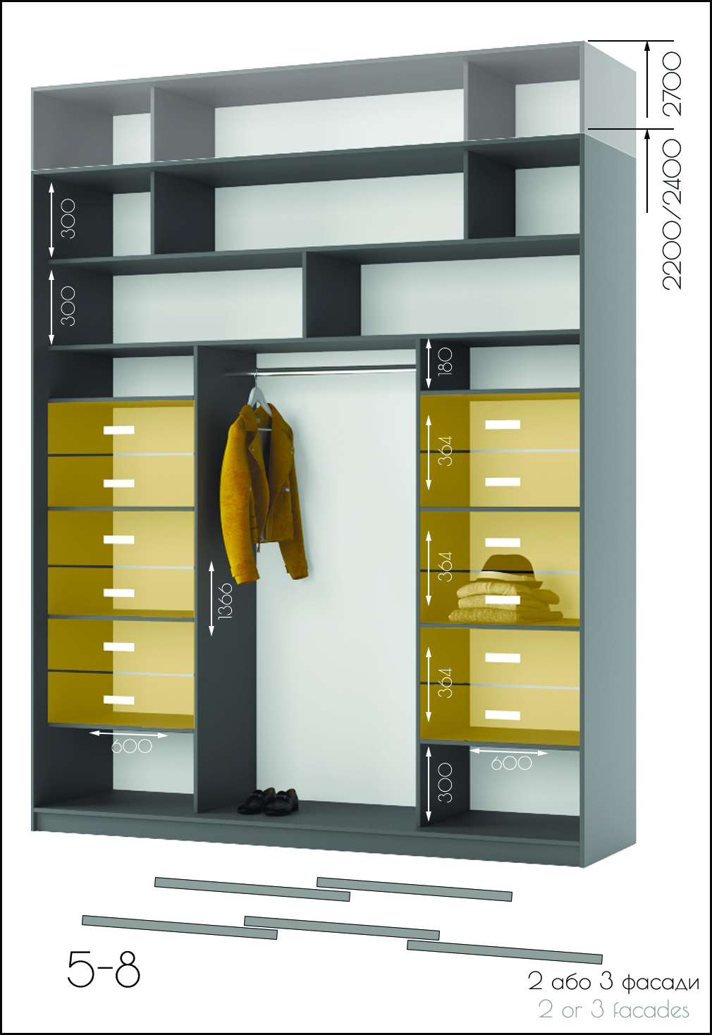 • Усі шафи-купе можуть доповнюватись висувними шухлядами, поличками та кутовими завершеннями.