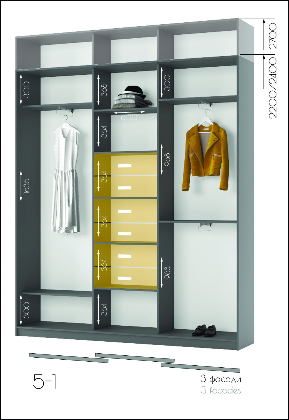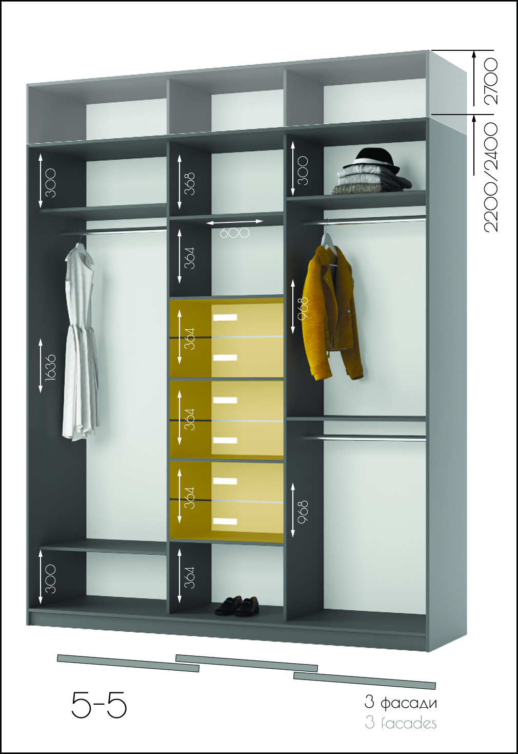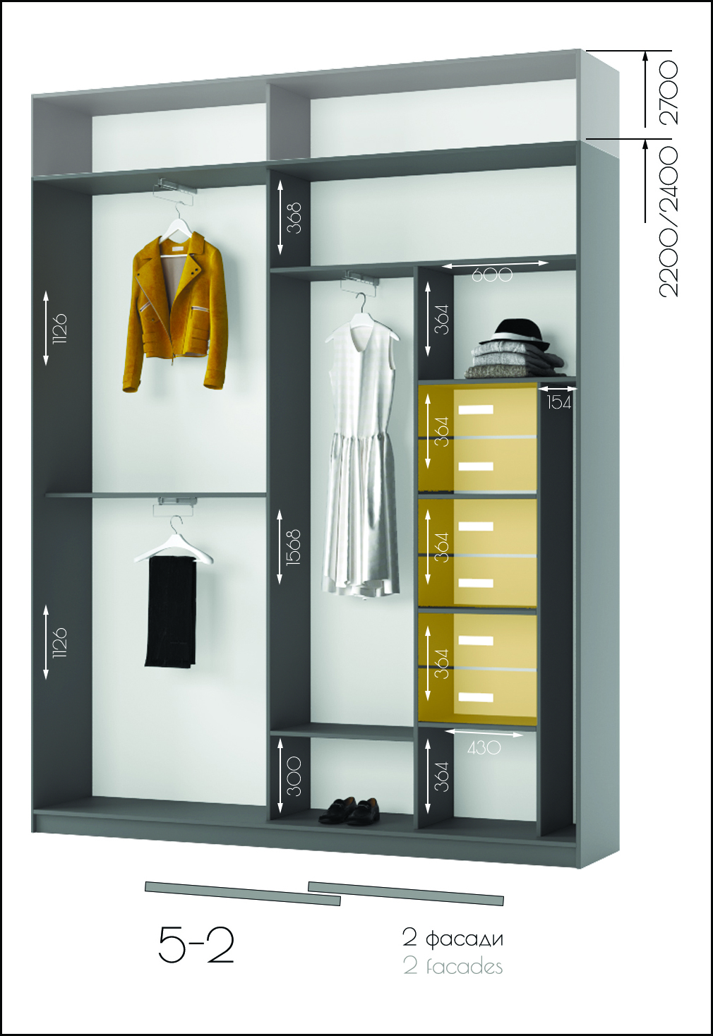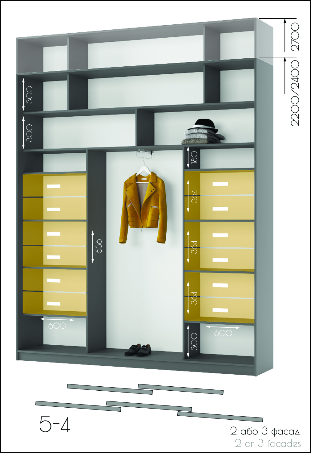 • Усі шафи-купе можуть доповнюватись висувними шухлядами, поличками та кутовими завершеннями.